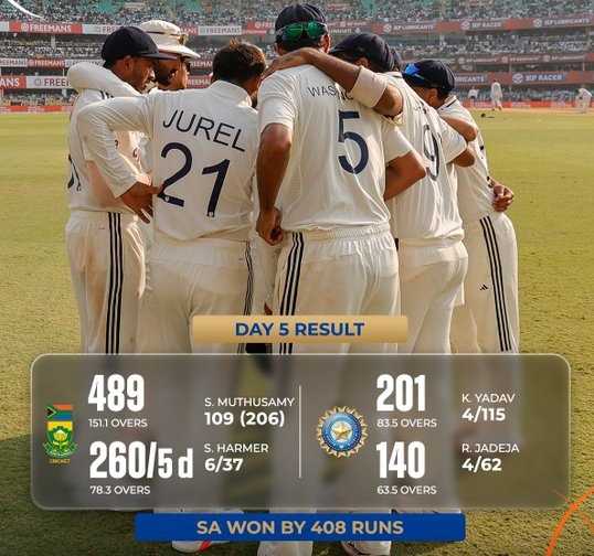 साउथ अफ्रीका के खिलाफ दूसरे टेस्ट में Team India का हाल ऐसा था जैसे किसी ने बैटिंग लाइनअप का Wi-Fi Password बदल दिया हो—कनेक्शन कहीं नहीं मिल रहा था!549 रनों के पहाड़ जैसे लक्ष्य का पीछा करते हुए पूरी टीम 140 पर सिमट गई। उसी गुवाहाटी की पिच पर जहां फैंस ‘Indiaaa…India!’ चिल्लाने आए थे… वहां आखिर तक सिर्फ आहें गूंजती रहीं। 25 साल बाद Proteas ने भारत को 2-0 से शुद्ध सफाई के साथ हरा दिया। अब नजर डालते हैं उन Top 5 विलेन प्लेयर्स पर जिनकी वजह से…