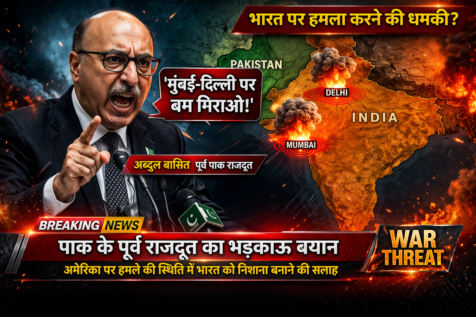 पूर्व राजदूत ने एक काल्पनिक युद्ध स्थिति का हवाला देते हुए कहा— अगर अमेरिका पाकिस्तान पर हमला करे, तो पाकिस्तान को जवाब में भारत को निशाना बनाना चाहिए… और मुंबई-दिल्ली जैसे शहरों पर बम गिराने चाहिए।