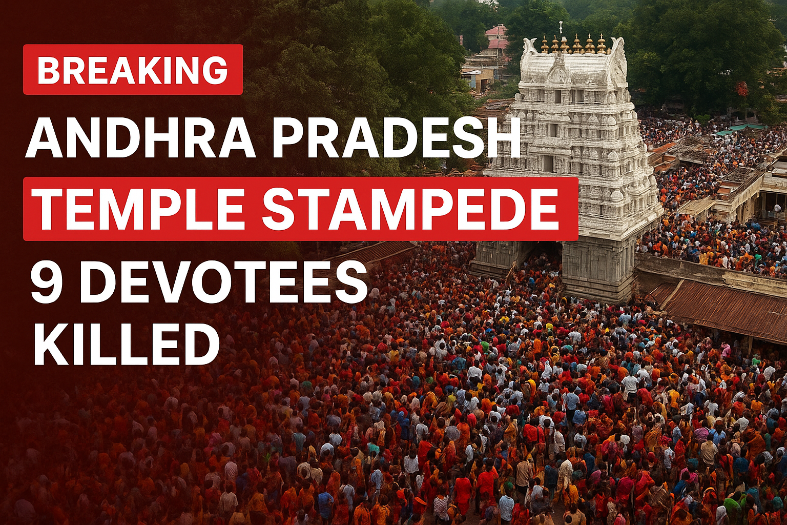 काशीबुग्गा स्थित वेंकटेश्वर स्वामी मंदिर में भगदड़ मचने से कम से कम 9 श्रद्धालुओं की मौत हो गई, जबकि कई लोग गंभीर रूप से घायल बताए जा रहे हैं।
