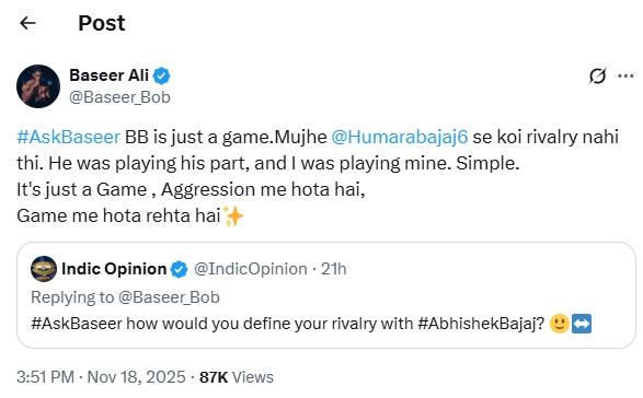सोशल मीडिया पर #AskBaseer ट्रेंड कर रहा था, तभी बसीर अली ने एक ट्वीट करके साफ कर दिया कि उनकी और अभिषेक बजाज की कोई दुश्मनी नहीं है। इंटरनेट पर चल रही “रियलिटी शो राइवलरी” की अफवाहों पर उन्होंने ब्रेक लगा दिया।