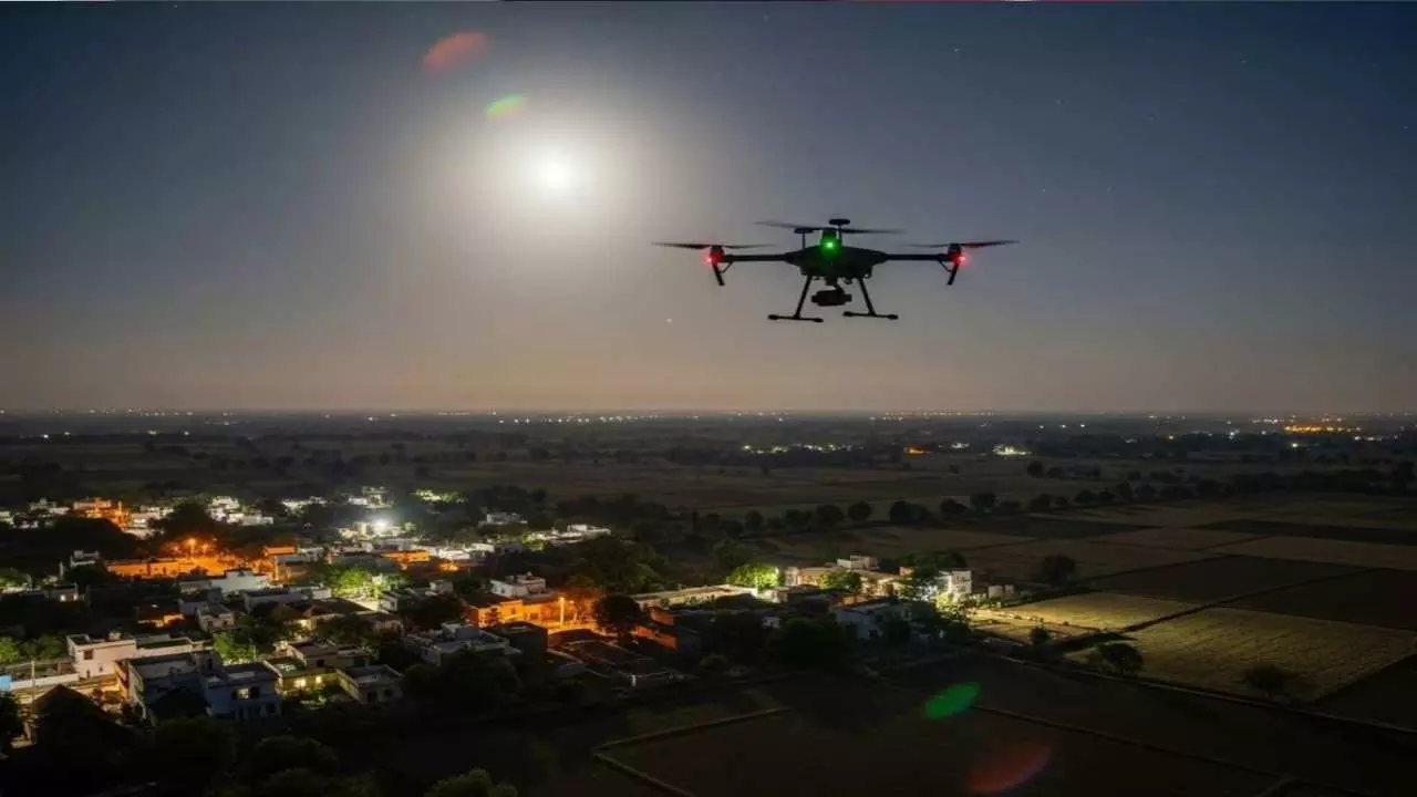 एक रात एक चौकन्ने ग्रामीण ने छत पर हल्की भनभनाहट सुनी। देखा – एक रोशनी टिमटिमा रही थी… ड्रोन!