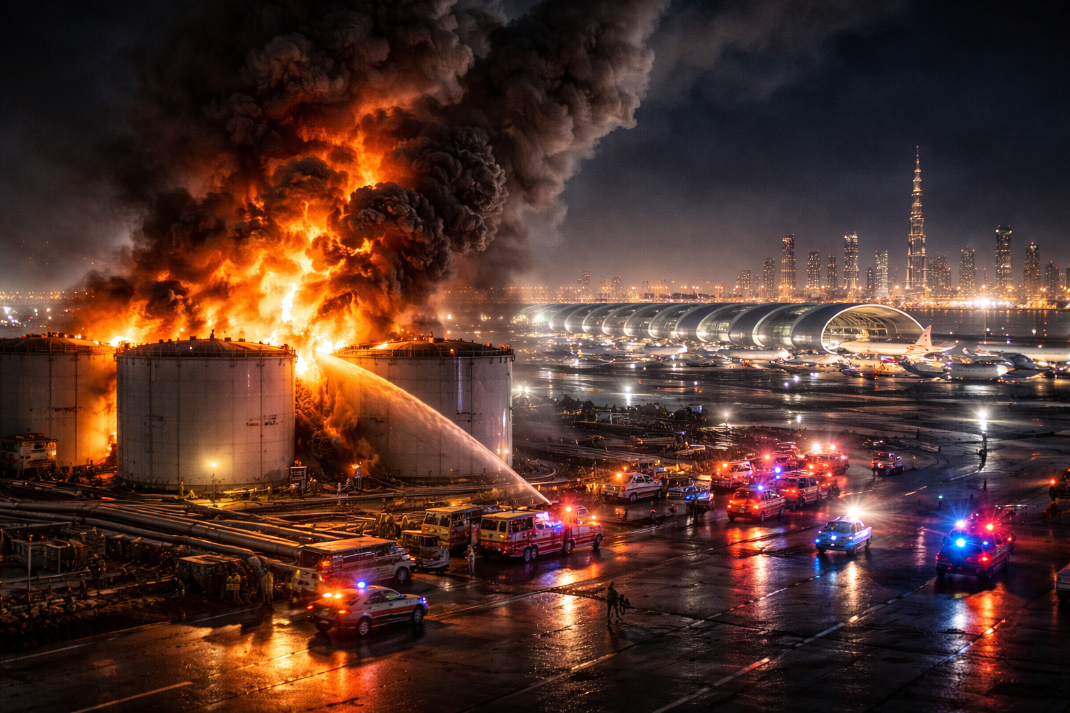 ड्रोन टकराने के बाद फ्यूल स्टोरेज एरिया में आग फैल गई। Dubai Civil Defence की टीमें तुरंत मौके पर पहुंचीं और आग बुझाने का अभियान शुरू किया। कई दमकल गाड़ियों और आपातकालीन इकाइयों को तैनात किया गया ताकि आग को आसपास के इलाकों में फैलने से रोका जा सके।