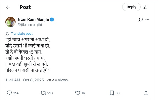 बिहार चुनाव 2025 की रणभेरी क्या बजी, NDA के खेमे में कुर्सी का कुरुक्षेत्र शुरू हो गया। बीजेपी और जेडीयू भले ही ‘आधी-आधी’ सीटों पर मन बना चुके हों, लेकिन जीतन राम मांझी जैसे छोटे लेकिन ज़िद्दी खिलाड़ी ने गेम में ट्विस्ट ला दिया है। “15 सीट चाहिए… और चाहिए अभी!” — ये नहीं किसी चुनावी नारों की गूंज नहीं, बल्कि रामधारी सिंह दिनकर की ‘रश्मिरथी’ से निकले मांझी जी के राजनीतिक तीर हैं। रश्मिरथी का पन्ना या पॉलिटिक्स का ड्रामा? जीतनराम मांझी ने सीटों की मांग ऐसे अंदाज़ में…