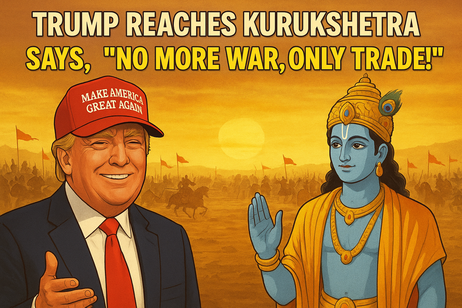 कुरुक्षेत्र के मैदान में जब अर्जुन अपना गांडीव नीचे रख चुके थे और श्रीकृष्ण गीता पाठ शुरू ही करने वाले थे, तभी आसमान से उतरता दिखा एक सुनहरा जहाज़ — और उसमें से उतरे अमेरिका के राष्ट्रपति डोनाल्ड ट्रंप! लाल टाई, सुनहरे बाल, और हाथ में “Make India Great Again” वाली टोपी लिए ट्रंप बोले — “This war is fake news! Let’s negotiate a trade deal between Kauravas and Pandavas.” ट्रंप की कूटनीति: युद्ध नहीं, बिज़नेस हाँ! ट्रंप ने सबसे पहले दुर्योधन से कहा — “You are a great businessman.…