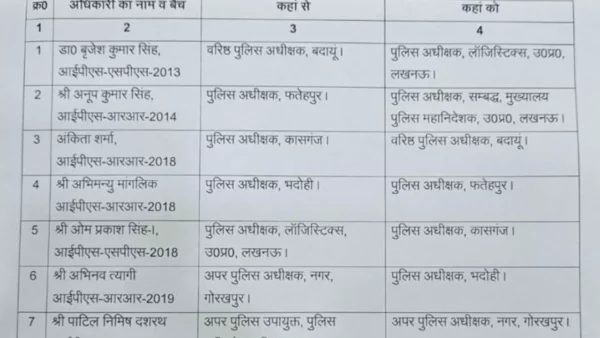 Uttar Pradesh Police मुख्यालय की ओर से जारी सूची में सात IPS अधिकारियों के कार्यक्षेत्र बदले गए, जिनमें चार जिलों के एसपी भी शामिल हैं।